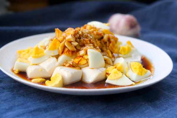 所需食材:雞蛋4個、嫩豆腐1塊、糖醋蒜4個、涼拌醬油
