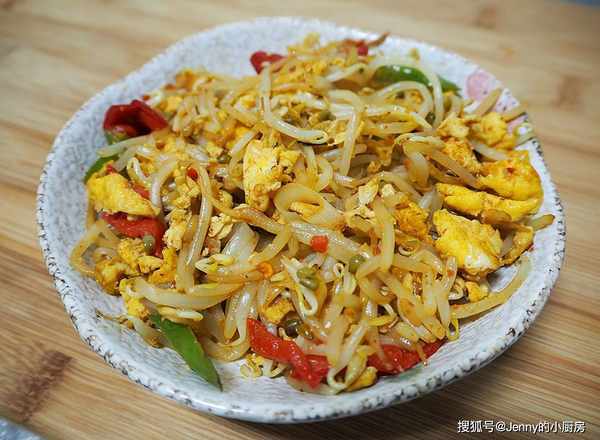 接著倒入青紅椒、綠豆芽翻炒,炒到斷生。最後倒入雞蛋翻炒均勻,再加入少許生抽、雞精,快炒幾下,這道菜就做好瞭。