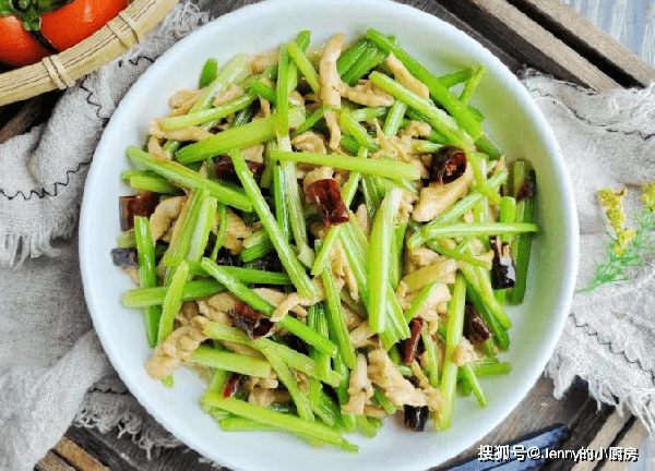 鍋內倒入薑絲、辣椒段爆香,再倒入芹菜翻炒,炒到斷生。