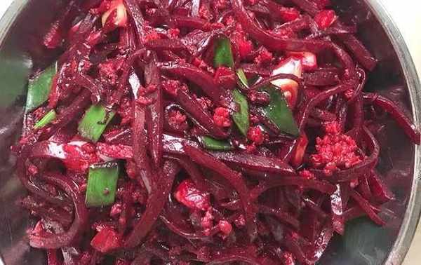 這次小六為大傢帶來蘿卜炒肉絲的做法。先準備主料:甜菜2根,鹽適量,五花肉適量,雞精少許,蒜薑適量,橄欖油適量,甜菜先處理,洗凈,切塊然後切片再切成細絲,然後將五花肉洗凈,切成細絲,大蒜、生薑切成顆粒狀。