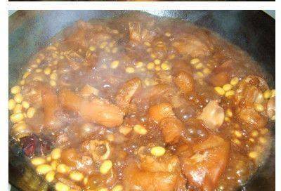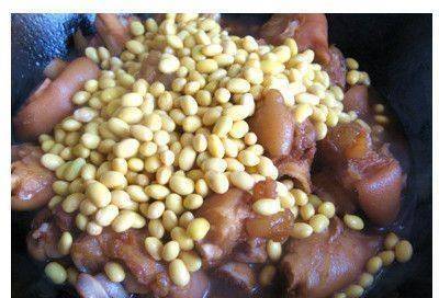 第三步:將烤好的豬腳倒入高壓鍋中,然後倒入清水,水一定要沒過豬腳,這樣燉出來的豬腳才會軟軟的,不容易幹透。然後將泡好的黃豆倒入鍋中,加入陳皮、八角、桂皮、鹽等材料。然後蓋上鍋蓋,用文火燉約30分鐘。時間一到,豬腳就軟爛瞭。然後將豬腳倒入鍋中,用旺火收汁。收汁後即可出鍋。