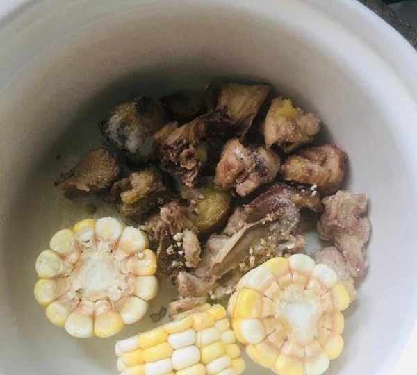 第2步、將雞肉和玉米放入砂鍋內,再放數粒胡椒碎。