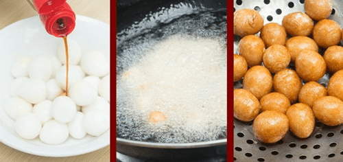 1、鵪鶉蛋用生抽抓均勻,鍋裡去油燒成高溫油,倒入鵪鶉蛋,炸至金黃色用漏勺撈起備用。