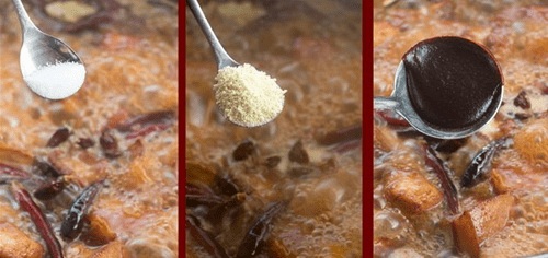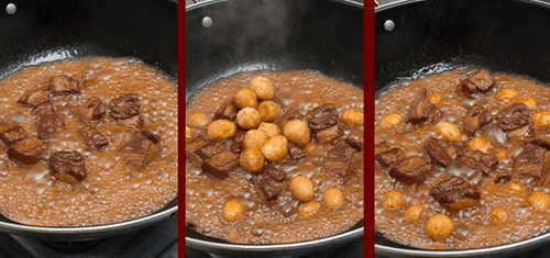 3、當肉炒至醬紅色,倒入一瓶啤酒,蓋上蓋子燜一下,開蓋加入適量的老抽、鹽、雞精、蠔油,大火煮開。倒入高壓鍋,放入小蔥結,再加適量的水,上汽後壓10分鐘,慢泄氣開蓋,撿掉香料,倒回炒鍋。