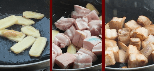 2、鍋裡去少量的油燒熱,下入薑片炒香,倒入五花肉用小火慢慢煸炒至油出色微黃,加入薑片、八角、桂皮、香葉、幹辣椒一起煸炒,香料炒出香味後,加入適量的紅糖繼續煸炒。