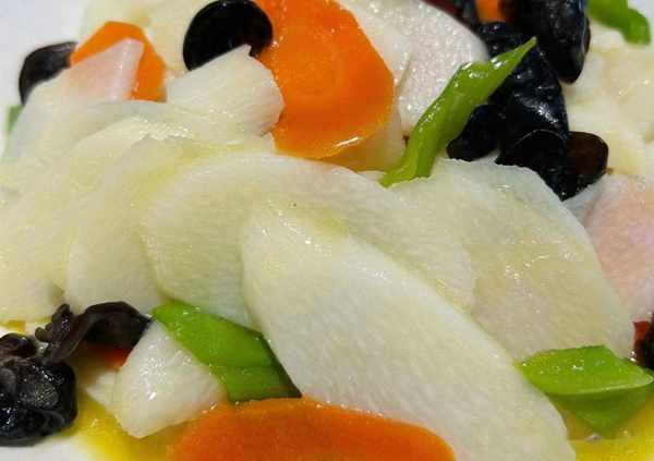 1、首先我們準備適量的黑木耳用溫水泡發,然後清洗幹凈之後鍋中燒水,把洗凈的木耳放入裡邊焯水備用,接著把山藥,胡蘿卜,青椒切成片備用。