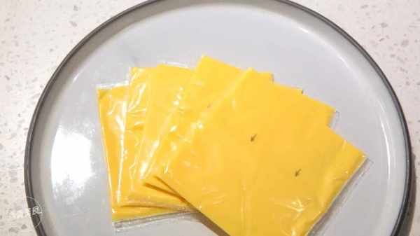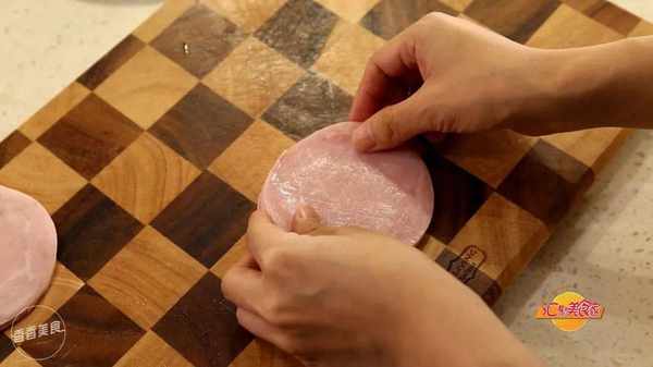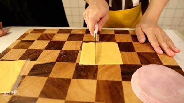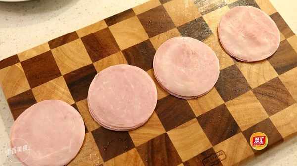 1.芝士片改刀,切成比火腿腸片小的大小;先鋪上兩片美式火腿片,放上芝士片後,再蓋上兩片美式火腿片,肉排的雛形就做好瞭(如果你覺得兩片火腿片吃起來不過癮,也可以一次選擇三片哦);