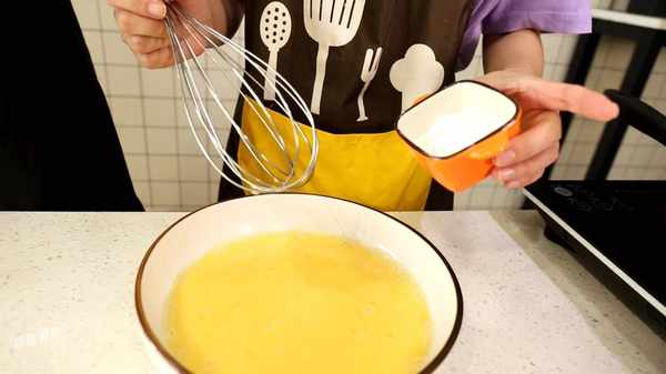 2.碗中打入兩枚雞蛋攪碎,隨後加入玉米淀粉攪拌均勻備用(玉米淀粉的用量按照:兩枚雞蛋40克玉米淀粉的比例);