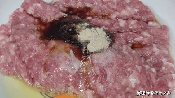 2.準備一些蔥薑,拍一下放入碗中,然後加入一些清水,抓捏出蔥薑汁,把蔥薑水加入肉餡裡面,這樣去腥的效果更好。接著加入一小勺鹽、一勺蠔油、一勺生抽、一點胡椒粉、打入一顆雞蛋,加入雞蛋吃起來更加的滑嫩,然後抓拌均勻,讓肉餡充分的吸收料汁,抓拌至肉餡有點粘稠後放一旁醃制20分鐘。