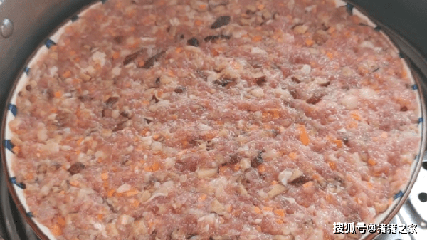 4.把肉餡倒入一個盤子裡面平鋪均勻,盡量鋪得稍微薄一點,這樣熟的比較快。然後上鍋蒸,鍋中水燒開後將肉餡盤放進去,然後蓋上蓋子轉中火蒸12分鐘。