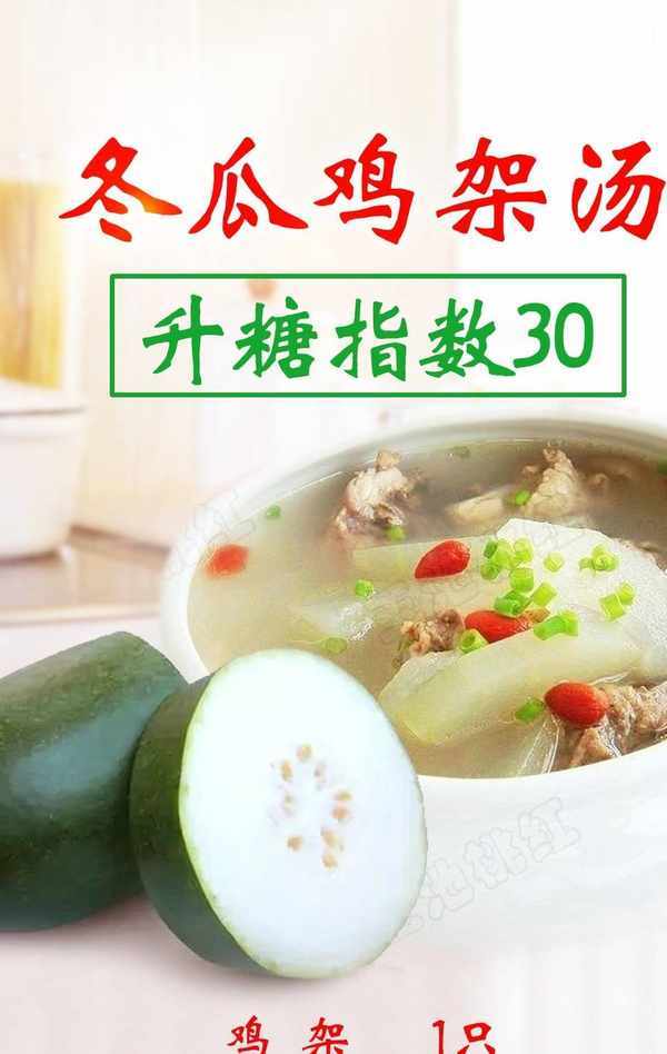2.冬瓜雞架湯升糖指數30:雞架1隻,冬瓜200克,鹽、枸杞、薑、蔥、胡椒粉適量。