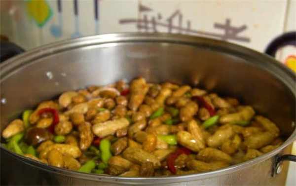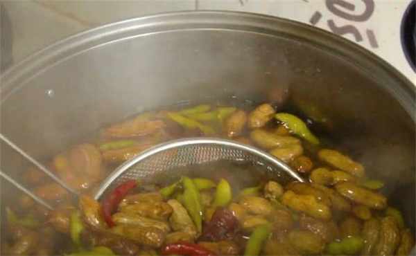 2.然後一起倒在鍋裡,放一些薑片、香葉、桂皮、八角,還有辣椒段,多加一些清水,我這是兩斤的毛豆一斤的花生,大概放八勺鹽,水開之後煮25分鐘。