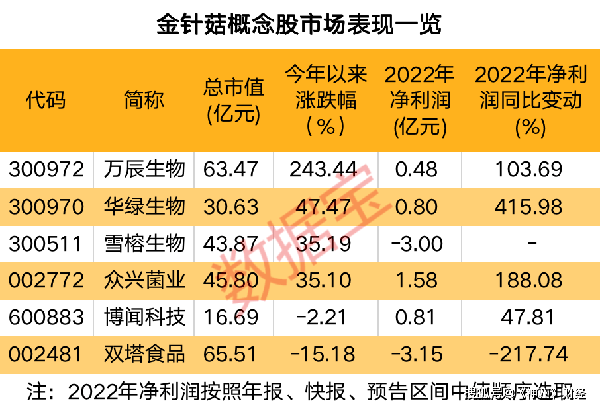 證券時報·數據寶梳理A股市場中的金針菇概念股,約有6傢上市公司業務涉及食用菌的繁殖繁育、采購銷售及生產加工。企業規模均較小,雙塔食品和萬辰生物最新總市值超60億元;眾興菌業和雪榕生物總市值均超40億元。