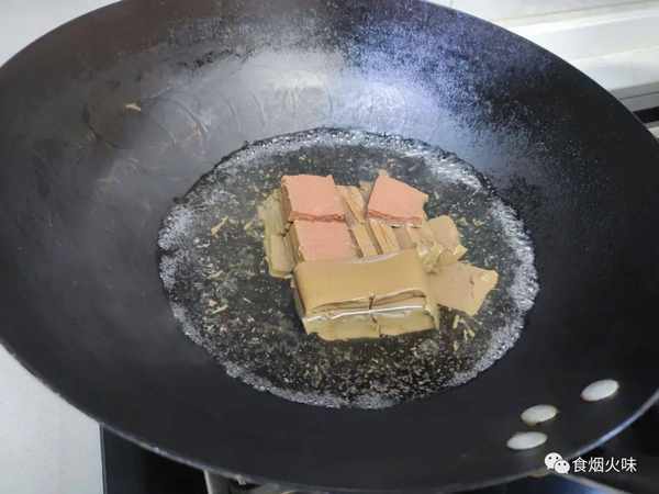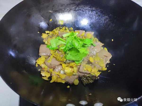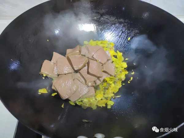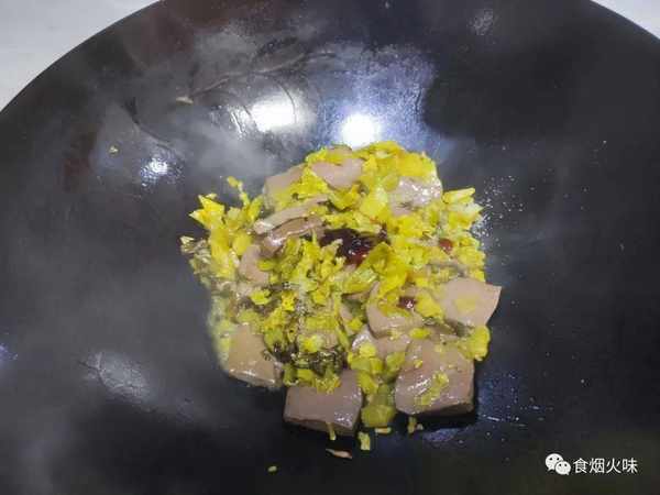 5.酸菜炒香之後,我們再將焯水後的鴨血倒入裡面。鴨血下鍋後用鏟子翻炒均勻,炒的時候一定要勤翻動,動作要輕一點,防止將鴨血搗碎;