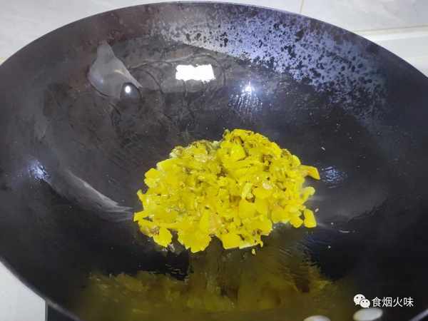 4.炒鍋中的水分幹後,倒入適量的油,油熱後,我們將切好的酸菜放入油鍋中用小火炒香。酸菜下鍋炒個三十秒,這樣子炒出來的酸菜口感才會好,而且味道特別鮮美;