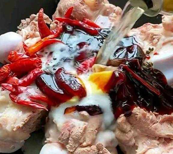 3、另起一鍋,把骨頭放入鍋中,放入薑、辣椒、麻椒、桂皮、大料,按個人口味添加,尤其是麻椒和辣椒。