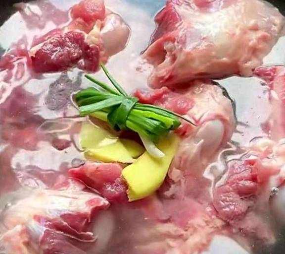 2、熱鍋燒水,涼水下入大棒骨,放入蔥薑、料酒去腥,焯至骨肉變硬、沒有明顯血色即可撈出。焯水期間會有大量的浮沫出現,用勺子把浮沫撇掉。另外煮骨頭的湯不要扔掉,湯可是很鮮的,鈣含量很多,可以二次利用。