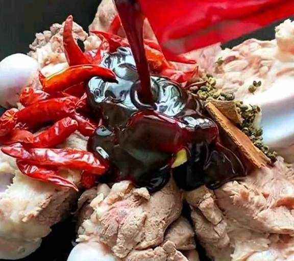 4、把準備好的大棒骨醬汁放入鍋中,這個也是根據自己的口味添加,可以自己先嘗一下味道。放瞭這個大棒骨醬汁其它調料就不用放瞭,所以它的味道偏重。這也是它的一個優點,制作簡單,簡單易學,隻放一種調料就可以,它是由多種調料混合在一起的。除瞭用於醬骨還可以用於醬肉肘子等,味道都十分的不錯。