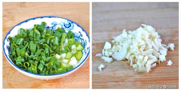 3、準備點蔥蒜,小蔥切蔥花,蔥白和蔥綠分切切,大蒜切蒜末。
