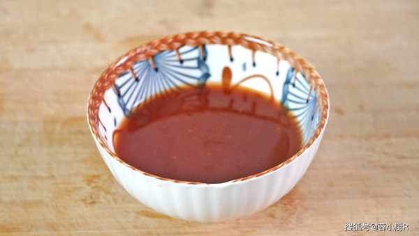 2、另準備一個碗、加一大勺番茄醬、一勺白糖、一勺鹽、一勺生抽、一勺白醋,攪拌均勻後糖醋汁就做好瞭。