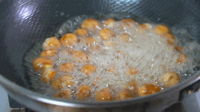 4、中小火慢慢炸,炸至鵪鶉蛋表面金黃,有虎皮的效果就可以瞭,撈出來控油備用。