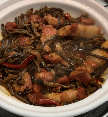 比如幹豆角和五花肉就是絕配,二者的精髓在於相得益彰,幹豆角吸足瞭五花肉溢出的油汁,變得綿軟油潤,而紅燒肉也少瞭油膩多瞭絲幹豆角的清香,更加軟糯可口,是搭配米飯的絕佳美味。