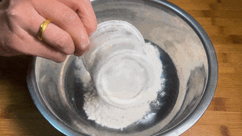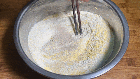 6. 放入盤中,再倒入面粉和玉米面中,用筷子攪勻