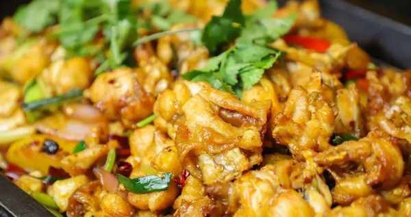 牛蛙經過油的洗禮再爆炒,全都染上油亮金黃的色澤,外表酥香特別能吸汁呢~