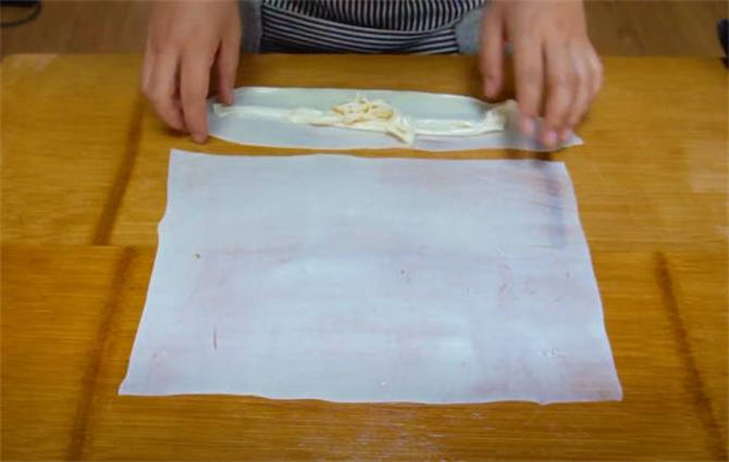5.先取出來一塊劑子按扁按開,用搟面杖搟成一張偏薄的餅皮,越薄越好,裁剪一下四周的形狀,這些邊角料還可以再次利用。
