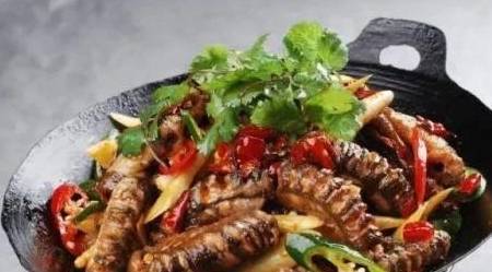 4、剩下的油裡放蔥段薑片炒香,下洋蔥、青椒、香料、冰糖、幹辣椒、幹花椒,三分之一塊火鍋底料,出香味之後下鱔魚和甜椒,加料酒,蠔油,少許鹽還有五香粉調味。最後下黃瓜,翻炒一下就可以瞭,我覺得黃瓜脆脆的比較好吃。