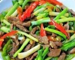 食材:蒜苗、羊肉、紅青辣椒、油、鹽、生抽、花椒粉、味精、淀粉、薑