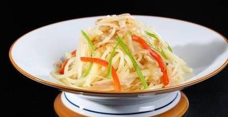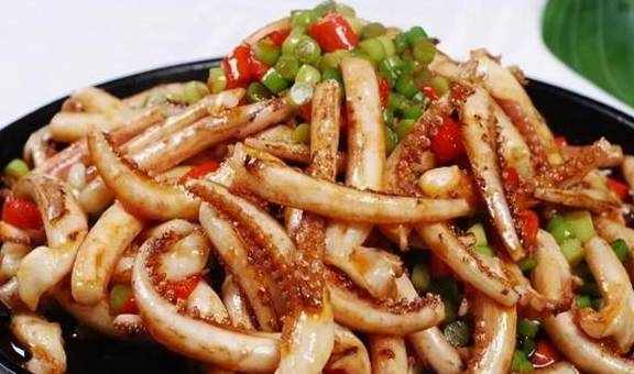 1、將魷魚用清水洗凈,切成5~6厘米長、0.2厘米寬的絲,放在瓦缽裡,倒入清水淹浸2小時取出,瀝幹水,蔥去皮、葉,切成細絲,綠豆芽摘去頭,根洗凈,放入開水鍋焯燙斷生,撈出,瀝幹水,盛於盤內,加些料酒、味精拌勻;