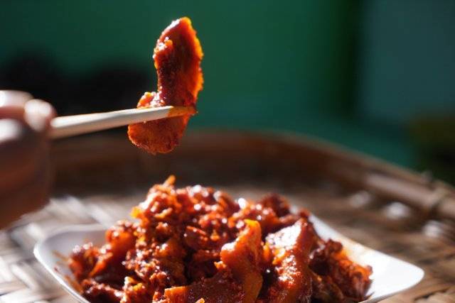 段熊是保山市第五批非物質文化遺產保護名錄更戛酸肉傳承人,他一直從事更戛酸肉的傳承、研發、制作和銷售。“我們傳承瞭老一輩的醃制技藝和醃制模式,醃制好的更戛酸肉入口有一點微微的酸味,吃到嘴裡有醇厚濃鬱的肉香,下咽後有一點回甜。”段熊說。