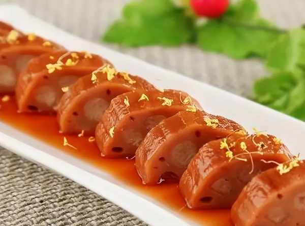 桂花糖藕是一道傳統的江蘇甜品,也是一種古老的甜食。主要原料是新鮮的藕、桂花和糖,口感酥脆,香氣撲鼻,非常受人們的喜愛。