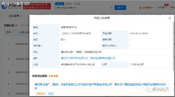 據天眼查消息,貴州習酒 股份有限公司近日新增一則開庭公告,被告為四川省瀘濤 酒業有限公司、貴州天下唐官酒業有限公司,案由為侵害商標權糾紛,該案將於 5月10日在成都高新技術產業開發區人民法院開庭審理。 天眼查顯示,該案件於2022年7月21日立案,在此則開庭公告前已有兩則開庭公告,開庭時間分別為2022年9月16日和2022年11月2日。