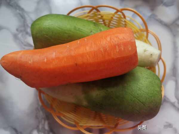 第二步:把青蘿蔔和胡蘿蔔洗淨備用。青蘿蔔含有豐富的維他命,是一種我們常吃的鹼性食材,能消炎殺菌,滋陰潤燥,很適合北方乾燥的秋天。平時多吃青蘿蔔能提高人體腸胃的消化能力,有助於排毒减肥等。而胡蘿蔔所含營養成分也很豐富,在蔬菜中享有盛名,有"小人參"之稱。所以在平時別看這些蔬菜都不起眼,但是營養卻很豐富。