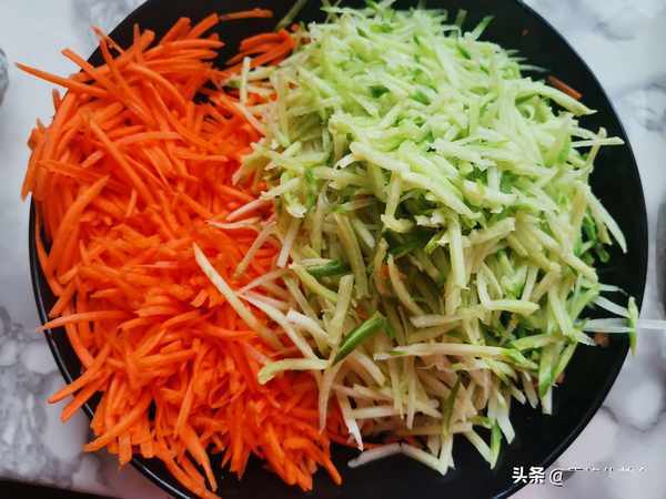 第三步:把青蘿蔔和胡蘿蔔都用擦絲器擦成細絲備用。