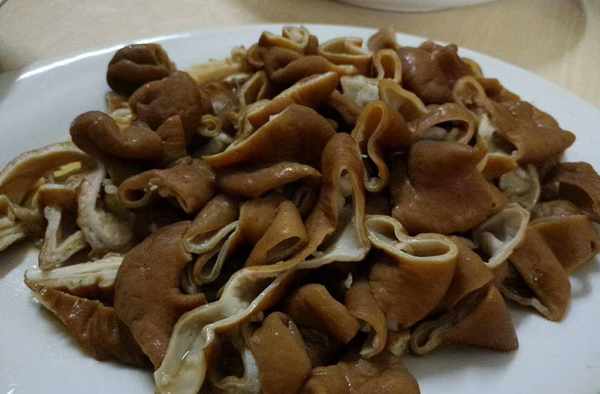 這好像是豬腸還是牛腸呢,油已經通過焯水去掉瞭。大多數女生都不會喜歡吃動物的內臟,可是這個真的非常好吃。聽說是加瞭點老抽,使用花生油、鹽巴醃瞭會,然後再炒的。處理得很幹凈,不油,不騷,不會粘牙齒,口感很特別。