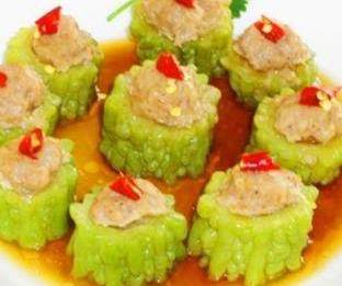 材料:苦瓜、去皮豬肉、雞蛋、油、鮮香菇、蝦,蒜瓣、精鹽、醬油、雞精、淀粉、蠔油