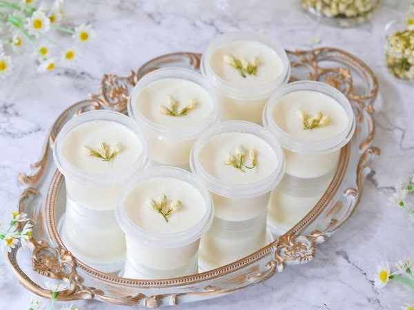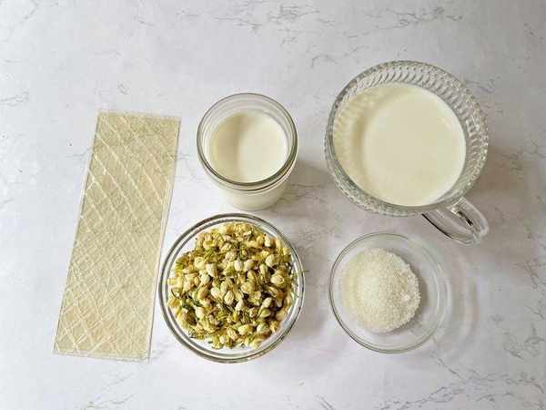 牛奶 500克;酸奶 100克;白糖 35克;茉莉花 20克;吉利丁片 4片