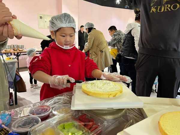 一把切刀、兩盒水果拼盤、多層蛋糕坯,在老師的認真指導下,大傢有板有眼地塗抹著、點綴著,完成瞭一個個富有創意的蛋糕作品。過程中,工作人員還不斷分發剛烘焙好的小餅幹,撲鼻的香氣使活動氣氛不斷升溫,大傢都樂在其中。
