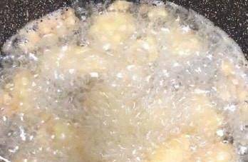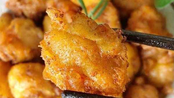 第五步:起鍋燒油,油溫七成熱倒入裹上面糊的雞胸肉,小火慢炸,炸至金黃撈出,喜歡脆一點的就再次復炸一遍
