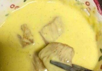 第四步:面糊中倒入醃制好的雞胸肉丁,將每一個肉丁都均勻裹上面糊