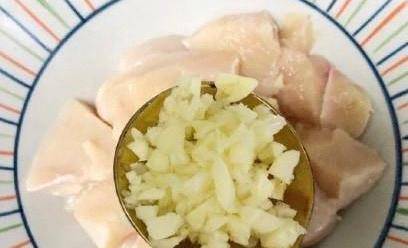 第二步:雞胸肉清洗幹凈切成均勻小丁狀,大蒜去皮洗凈切末