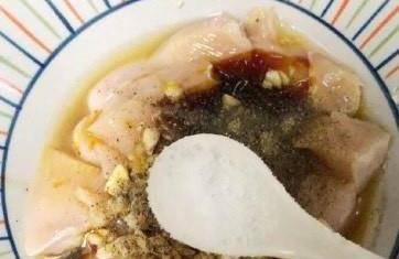 第二步:切好的雞胸肉加入適量的蒜末,兩勺生抽,一勺蠔油,適量黑胡椒,一小勺食用鹽,抓拌均勻醃制十分鐘