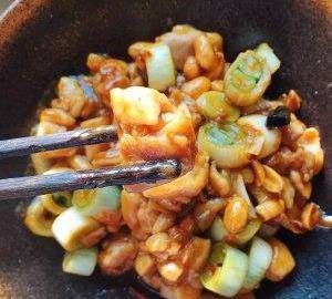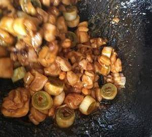 炒動幾下至芡汁透明後放入蔥段兒和花生仁兒,繼續翻炒,均勻後即可出鍋