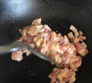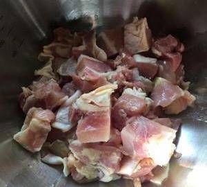 帶著皮剁成大拇指大小的方丁。帶著皮的雞丁炒出來更鮮嫩,不吃雞皮的寶寶也可以去掉再切。