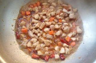 3.鍋裡放入油,放入醃制好的雞肉丁翻炒,等肉都變色後,盛出來放入盤子裡