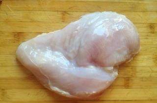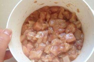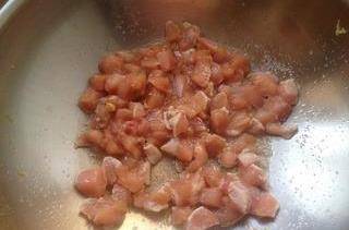 2.雞胸脯要去掉上面的筋膜,切成1點5厘米左右的正方塊,放入碗裡,放入一點淀粉,鹽,料酒,醬油醃制20分鐘