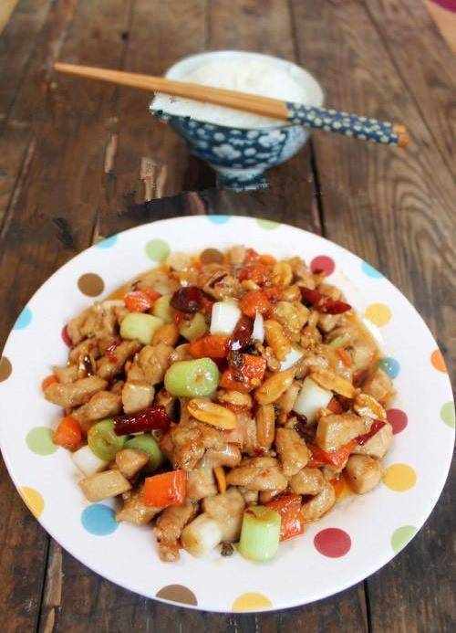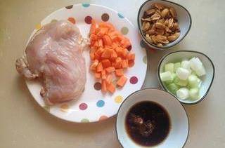 備料:雞胸肉300g,花生米50g,大蔥50個,幹辣椒10g,胡蘿卜100g。